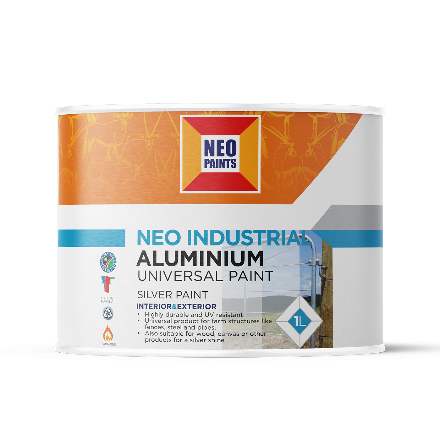 NEO Industrial Aluminium is a long-life coating for a wide range of objects to give them an aluminium finish. NEO Industrial Aluminium is suitable for interior use but is mostly used for exterior objects for e.g. fences, steel structures, pipes and tanks that require UV resistance from the harsh Namibian climate. The product is only…