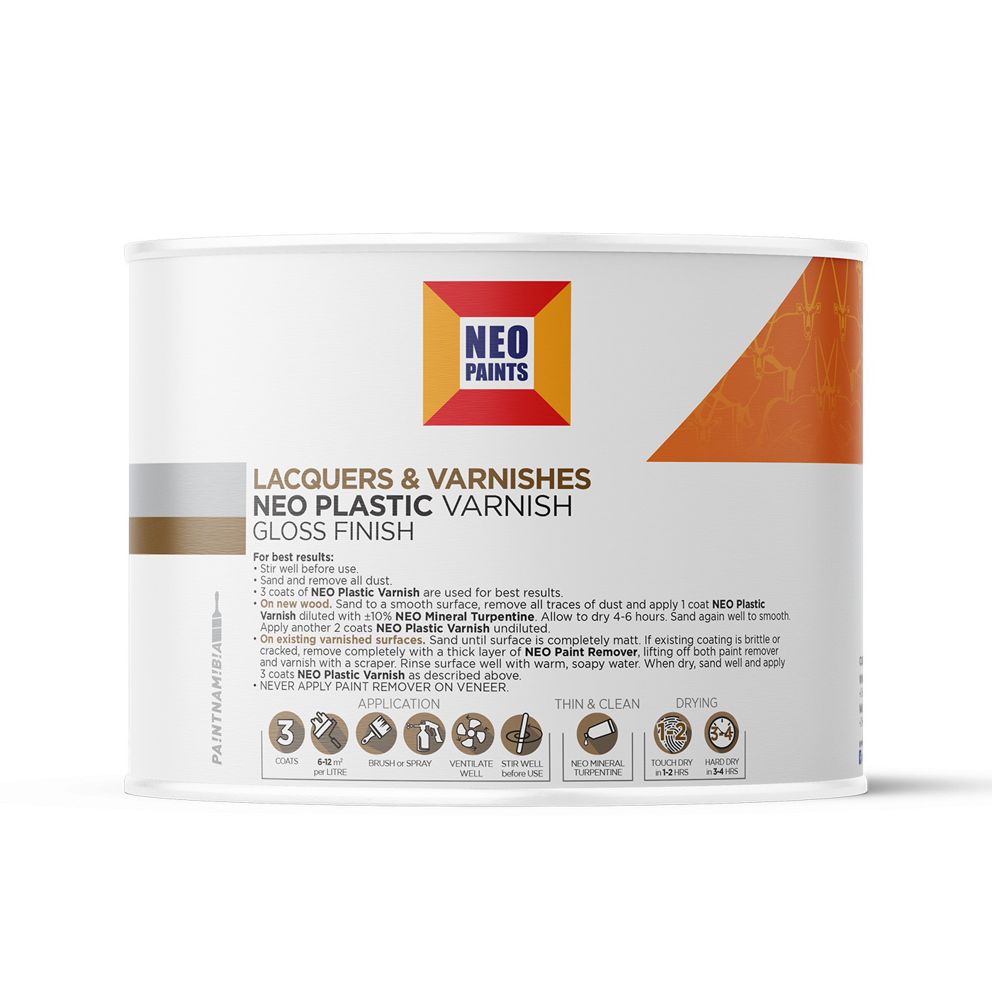 • On new wood. Sand to a smooth surface, remove all traces of dust and apply 1 coat NEO Plastic Varnish diluted with ±10% NEO Mineral Turpentine. Allow to dry 4-6 hours. Sand again well to smooth. Apply another 2 coats NEO Plastic Varnish undiluted.