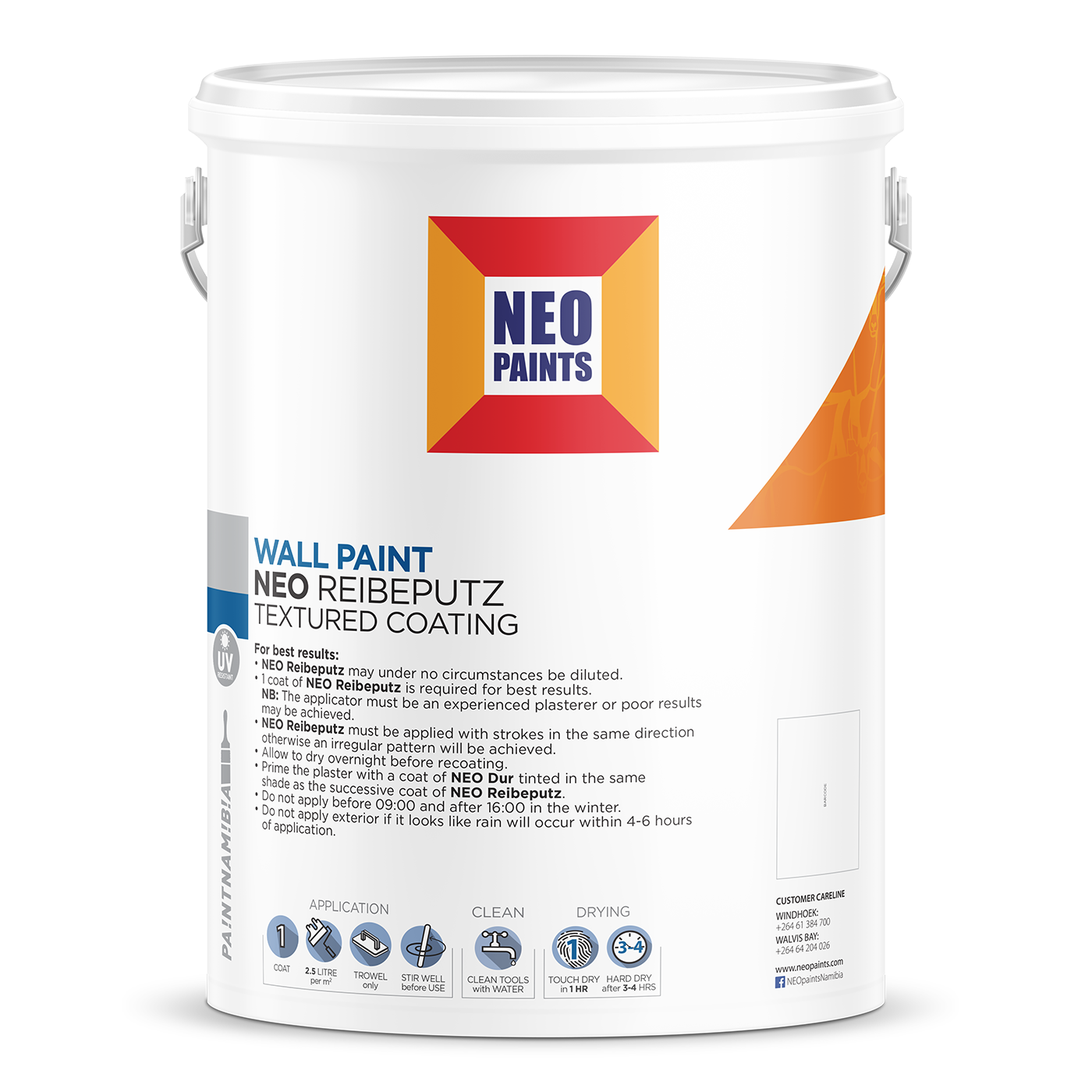• 1 coat of NEO Reibeputz is required for best results. NB: The applicator must be an experienced plasterer or poor results may be achieved.